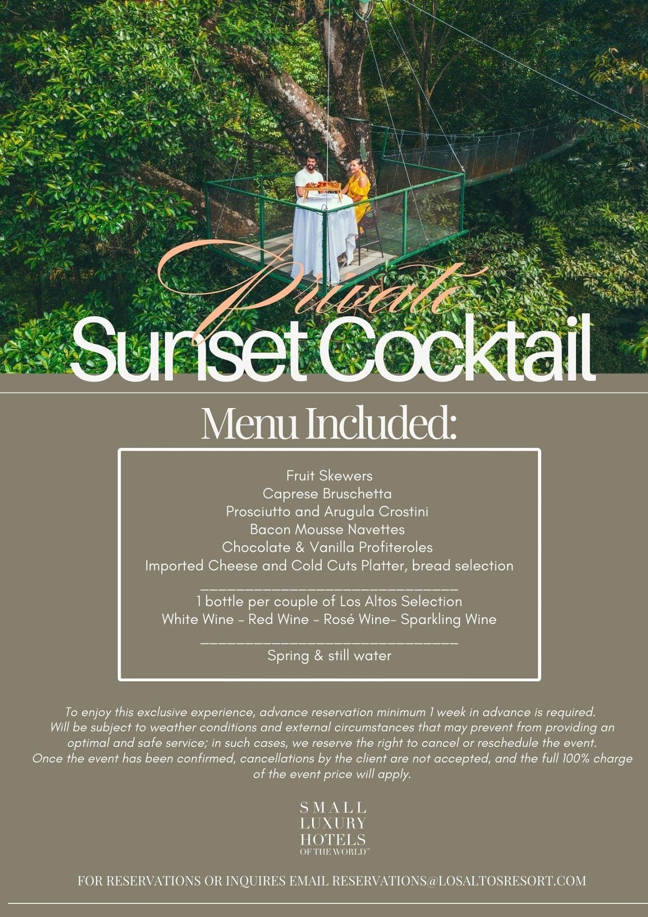 For those who dream in sunsets, our Private Treetop Sunset Cocktail Experience invites you to ascend to a secluded platform overlooking the Pacific. Suspended above the canopy, you sip handcrafted cocktails as the sky blushes from gold to coral to indigo. The ocean stretches endlessly before you, the jungle hums below, and the moment belongs only to two. Nature provides the stage. We simply set the scene for love to take center spotlight.